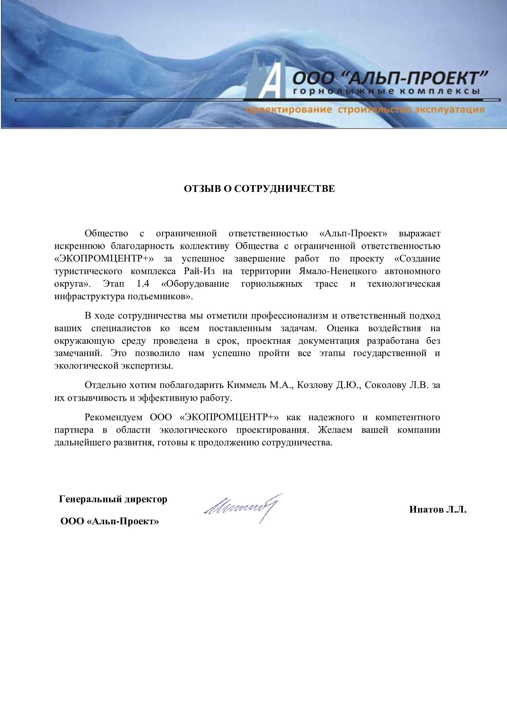 Общество с ограниченной ответственностью «Альп-Проект» выражает искреннюю благодарность коллективу Общества с ограниченной ответственностью «ЭКОПРОМЦЕНТР+» за успешное завершение работ по проекту «Создание туристического комплекса Рай-Из на территории Ямало-Ненецкого автономного округа». Этап 1.4 «Оборудование горнолыжных трасс и технологическая инфраструктура подъемников».