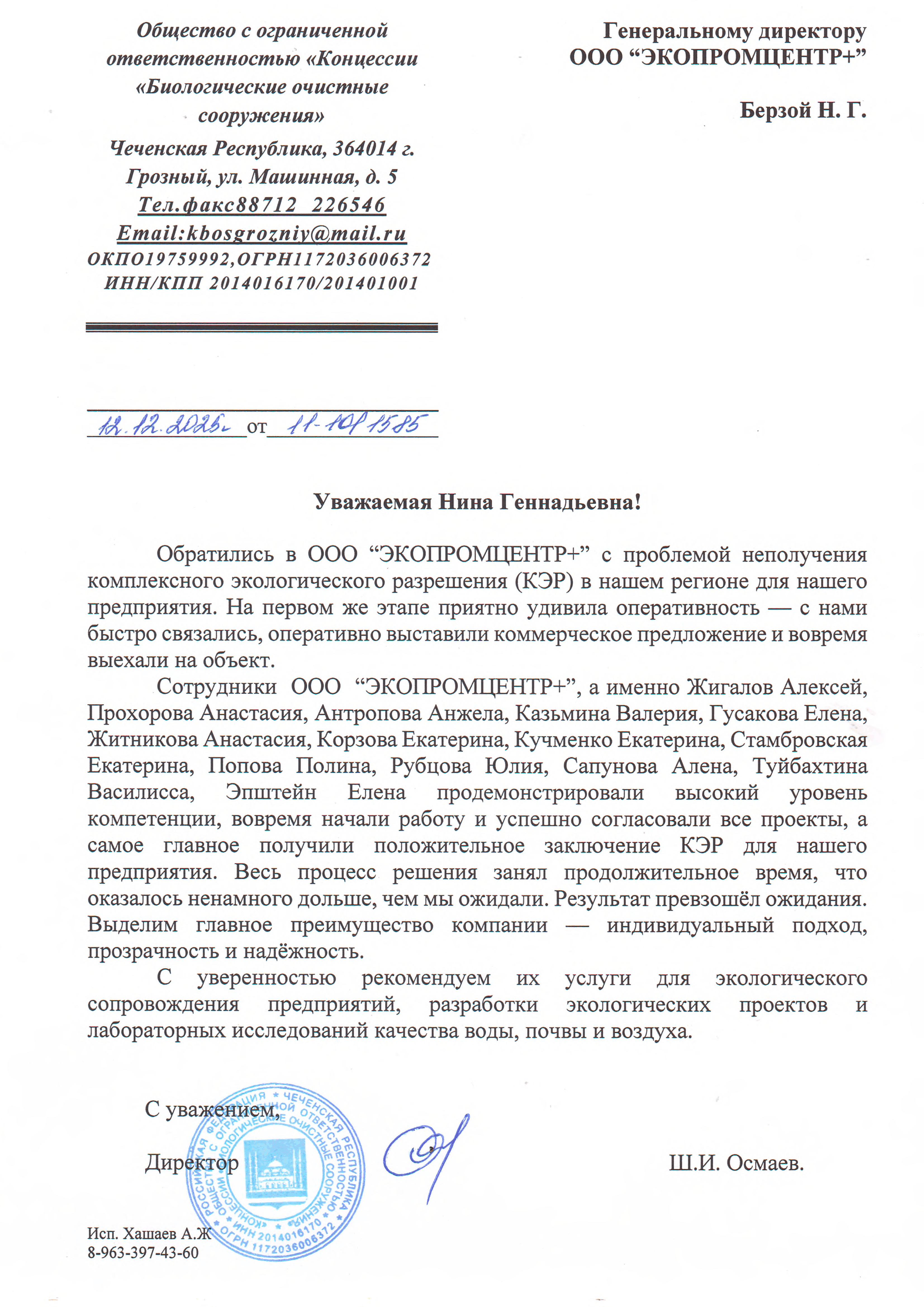 Сотрудники ООО «ЭКОПРОМЦЕНТР+», а именно Жигалов Алексей, Прохорова Анастасия, Антропова Анжела, Казьмина Валерия, Гусакова Елена, Житникова Анастасия, Корзова Екатерина, Кучменко Екатерина, Стамбровская Василиса, Эпштейн Елена продемонстрировали высокий уровень компетенции, вовремя начали работу и успешно согласовали все проекты, а самое главное получили положительное заключение КЭР для нашего предприятия. Весь процесс решения занял продолжительное время, что оказалось ненамного дольше, чем мы ожидали. Результат превзошел ожидания. Выделим главное преимущество компании – индивидуальный подход, прозрачность и надежность.