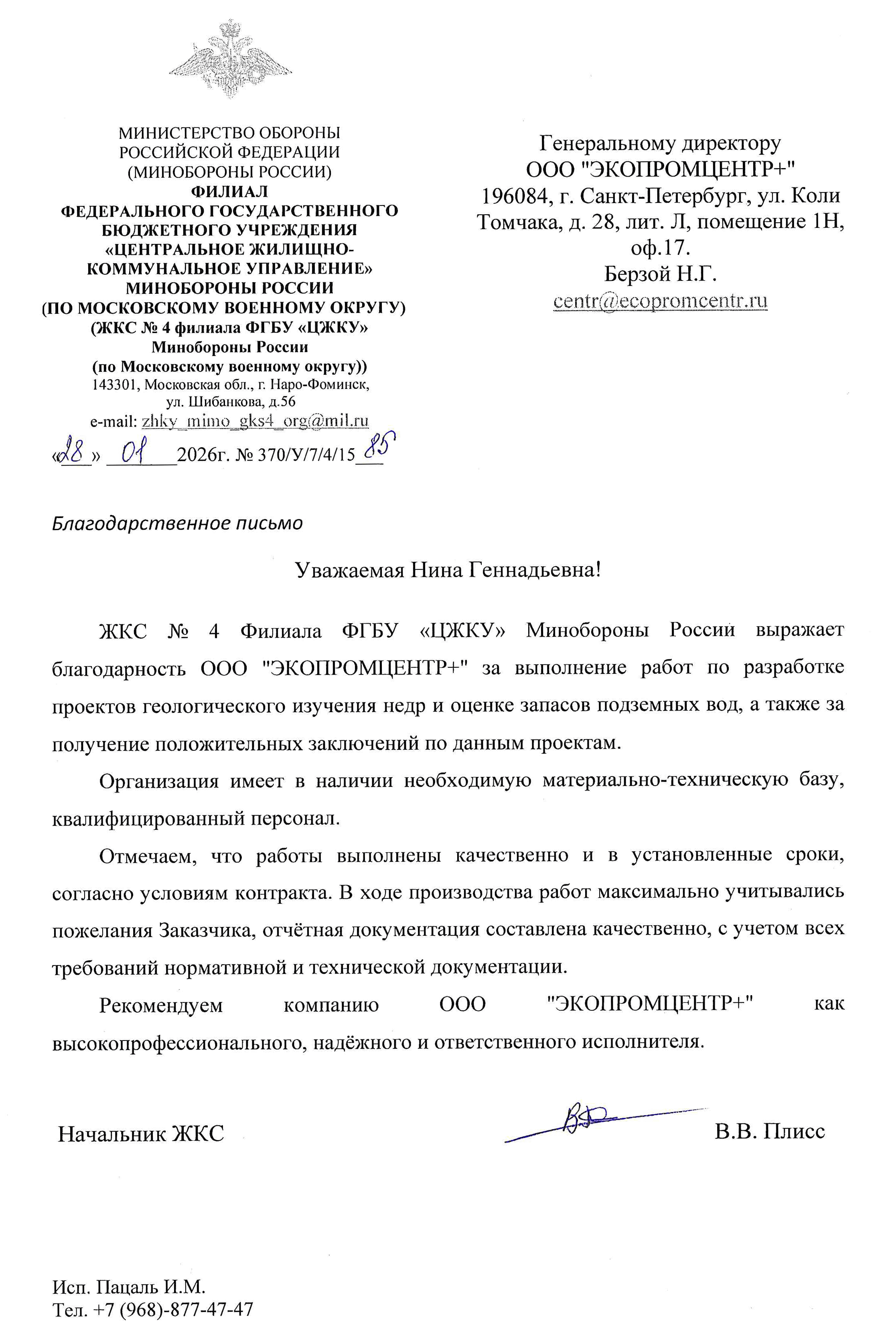 ЖКС № 4 Филиала ФГБУ «ЦЖКУ» Минобороны России выражает благодарность ООО «ЭКОПРОМЦЕНТР+» за выполнение работ по разработке проектов геологического изучения недр и оценке запасов подземных вод, а также за получение положительных заключений по данным проектам.
