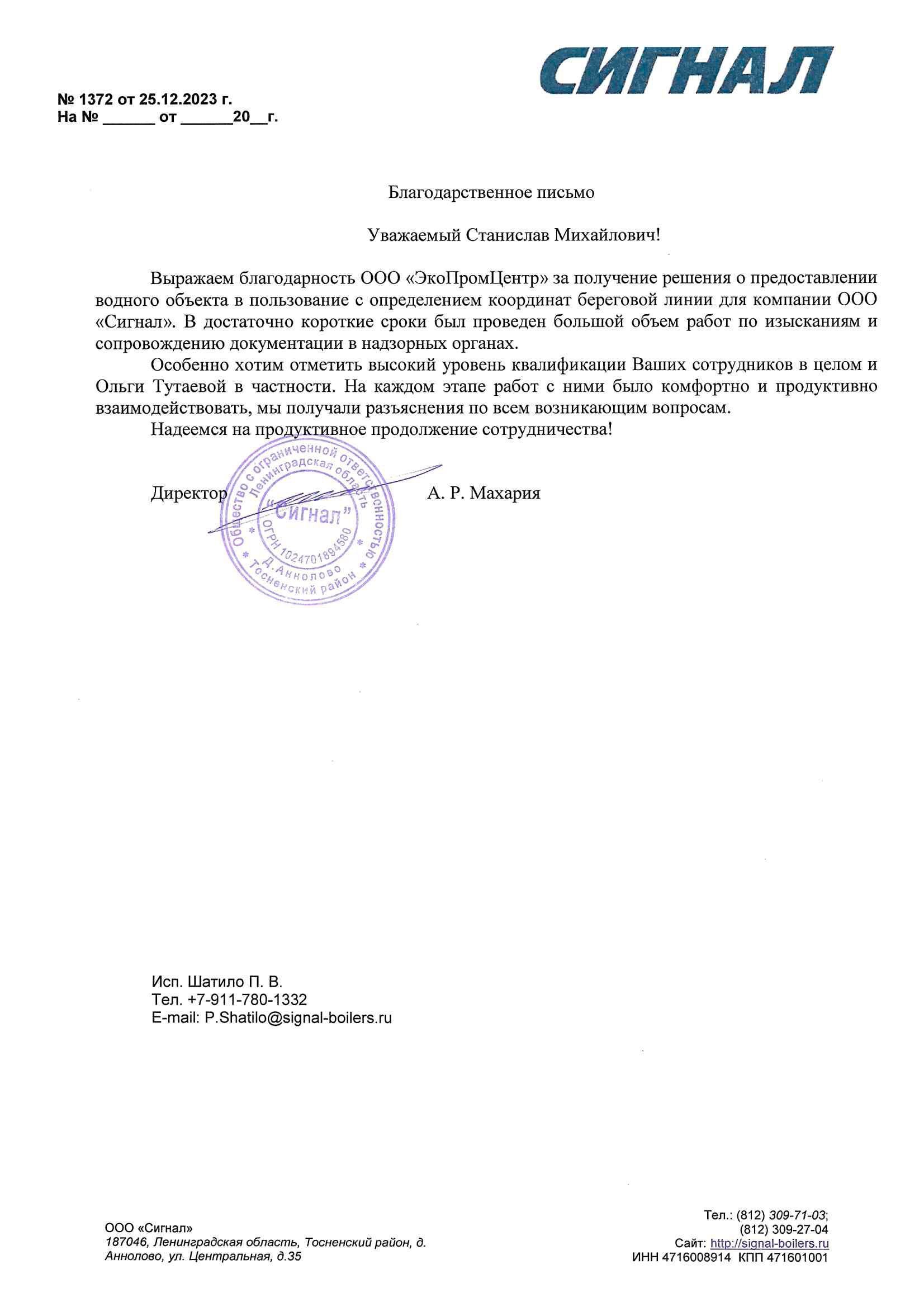 Получено решение о предоставлении водного объекта в пользование с определением координат береговой линии. ЭкоПромЦентр оказывает полное экологическое сопровождение для ООО «Сигнал».Мы получили уникальный опыт определения координат береговой линии, поскольку ориентировались на новые требования законодательства, указанные в Постановлении Правительства РФ от 19.01.2022 № 18 (ред. от 18.02.2023). Для нас главным показателем отличного результата является доверие заказчика и продолжение сотрудничества, а подтверждение официальный отзыв.